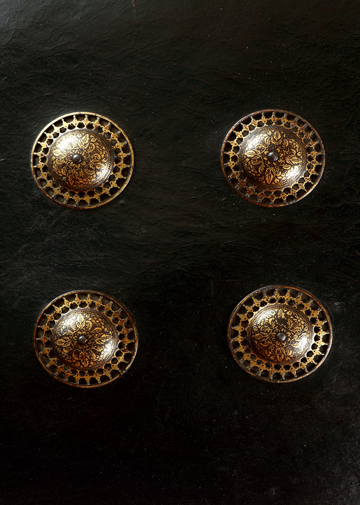 In her 2017 book, Salam Kaoukji[1] provides details of a single shield boss with similar openwork from the Al-Sabah Collection in Kuwait. She explains that it is probably Deccani in origin. With the stylised peony flowers on the bosses of this shield being similar—although more delicately fashioned with greater detail and less gold—the same geographical attribution is likely.