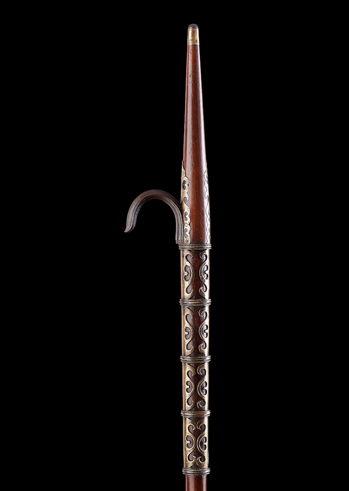 This elephant goad (or ‘ankus’) is comprised of a reddish-brown hardwood haft to which a series of curved brass mouldings have been attached, a thick recurved iron hook, two silver collars, the final section carved into a cone-shape and attached with a small iron cap.