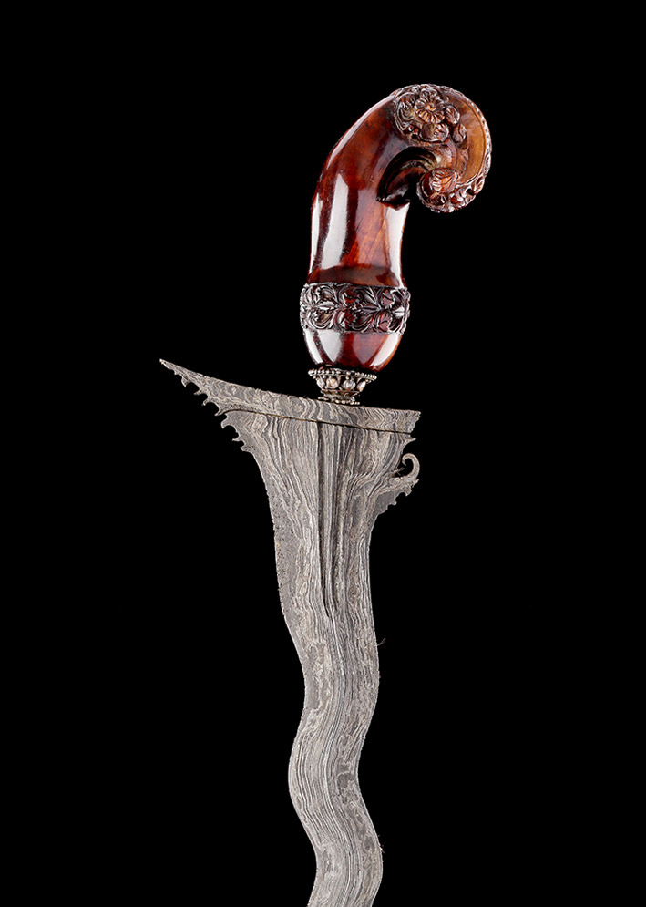 Keris Madura from 18th century Bangkalan (Sumenep). The dapur (blade shape) classified as sangkelat robyong. The pamor (blade pattern) known as adeg sapu (broom hair). The scabbard in a beautiful dark wood with a knotty pattern. The wrangka (boat shaped throat piece) seemingly a solid piece of wood, and the pendok (lower part of the scabbard) being veneered.