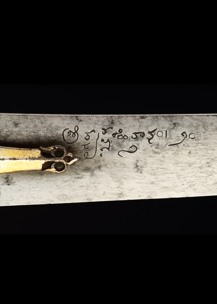 The steel blade of heavy gauge displays a pattern of crucible steel (jawhar), that can be categorised as ‘Sham Wootz’ (named Sham after Bilad-al-Sham an ancient caliphate in Syria where Damascus was the capital). The characteristics of this steel are best described in the book that accompanied an exhibition at the King Faisal Centre for Research and Islamic studies in Riyadh, Saudi Arabia, 1991 called Weapons of the Islamic World: Swords and Armour(1): “Beautiful wave-like patterns formed in well-cut, geometric designs and famous for the light, almost white colours; known for their smooth, rust-resistant blade, with soft, stippled surfaces and a generally light-grey colour.” The blade is marked in Kannada script with the armoury marking of the Mysore armoury which reads: