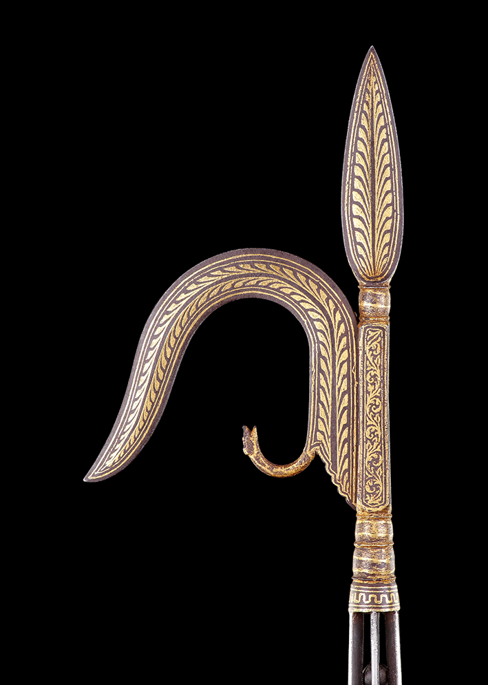 This elephant-goad (or ‘ankus’) is formed with a basal cap overlaid at its brim with alternating chevrons in silver and gold, from which rise vertical panels of curling vine tendrils in gold framed by silver borders. The openwork handle has been lined with gold and silver overlay and comprises six tiers each filled with a bell, so that the goad produces a ringing sound when swung. The ankus’ head comprises two spikes – one conical and the other curved – the latter formed at its interior terminal to depict the miniaturised body and head of a makara. The surface is decorated throughout with gold foliate designs, the central section replicating the motif found at the base of the handle.