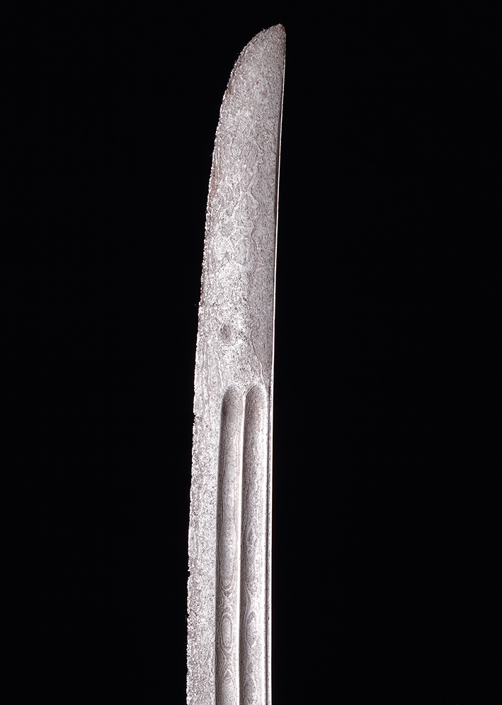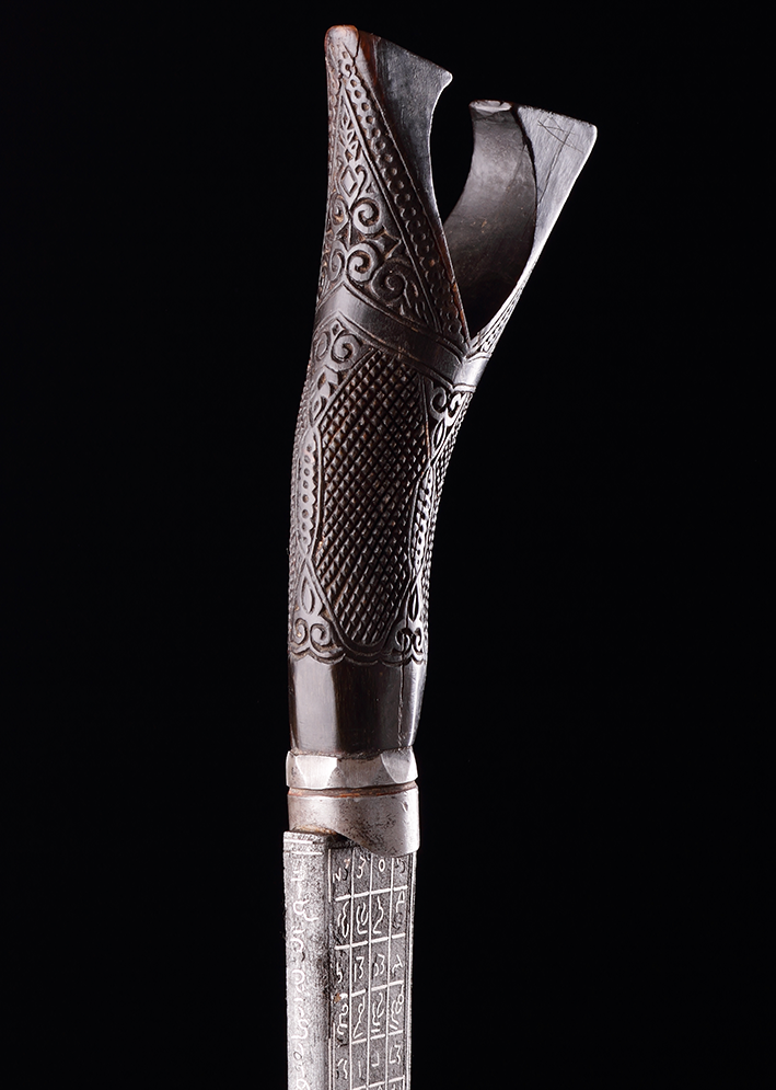This sword is a highly desirable example of its type and boasts numerous inscriptions to the blade. The forked hilt has been profusely carved and presents neatly chequered panels and triangular sections of scrollwork. The blade is chased with Arabic numbers and scripts and inlaid with silver wire. The hilt probably comes from the 19th century, but the blade is conceivably earlier.