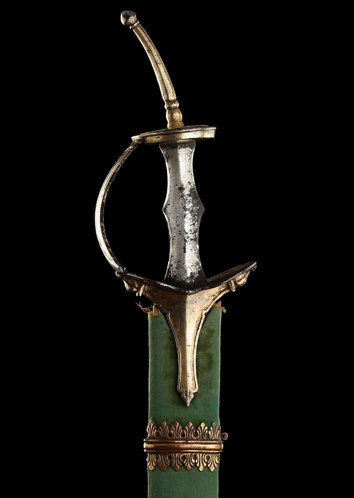 The scabbard is probably 19th century in date, having a wooden core covered with green velvet and fitted with a copper-gilt chape and suspension loop with an openwork design.