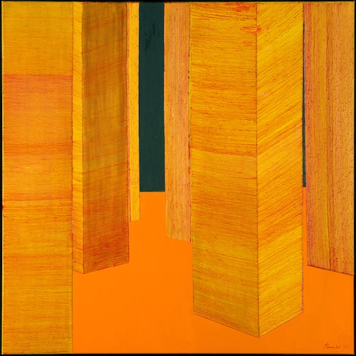 The fine and tightly organised, raised lines that course across Suminder Virk’s canvases are magnetising. The tracks, like meticulously raked sand, corrugated metal or threads in a delicately woven fabric, have an accumulative effect. En masse and viewed at a distance, her textural surfaces play with light and colour seeming to undulate, hum and ripple with a slow intensity. In Scorching June 2 (2025, these lines appear derivative of contours on a map and evoke the shape of land. At the painting’s base, the repeated and dense lines build up a rugged stretch of brown, mountainous terrain above which a fiery yellow plane looks animated with forces rarely seen, such as undercurrents and air pressure.